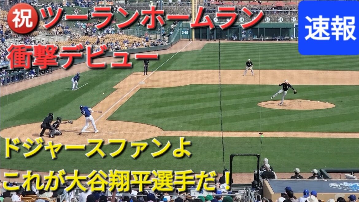 ドジャースのオープン戦で衝撃デビューの大谷翔平選手。第3打席目で見事なツーランホームランを打ってドジャースファンの心を鷲掴み!