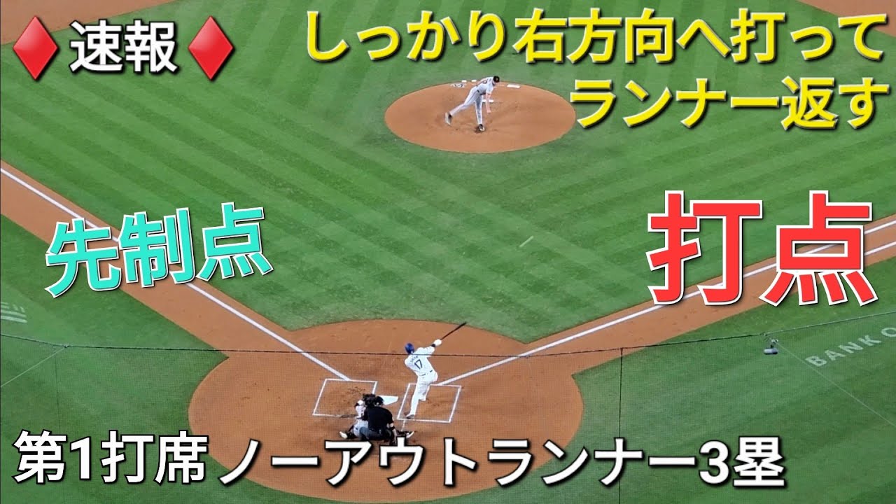 ♦️速報♦️第1打席【大谷翔平選手】ノーアウトランナー3塁での打席‐しっかり右方向へ打って、ランナーを返して先制点‐打点 vs ジャイアンツ~シリーズ初戦~