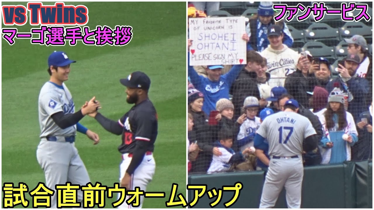 ウォームアップ中にマーゴ選手と挨拶を交わす。今季2度目の敵地でのファンサービスをする大谷翔平選手。