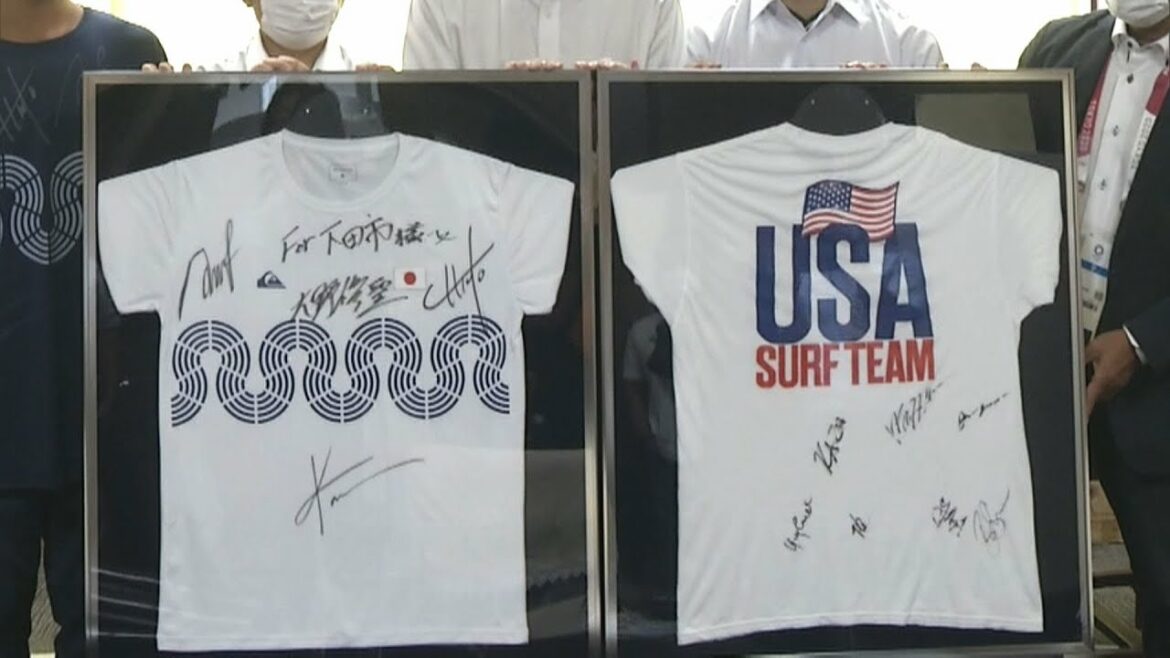 Tシャツを送ったのは、サーフィンの日米両チームの代表選手らです。これは今大会から正式競技となったサーフィンのホストタウンの下田市の中学生らが応援メッセージを書いた国旗を両国に届けたお礼として贈られたものです。両チームのメダリストらのサイン入りTシャツは、市内4つの中学校に順番に展示されます。