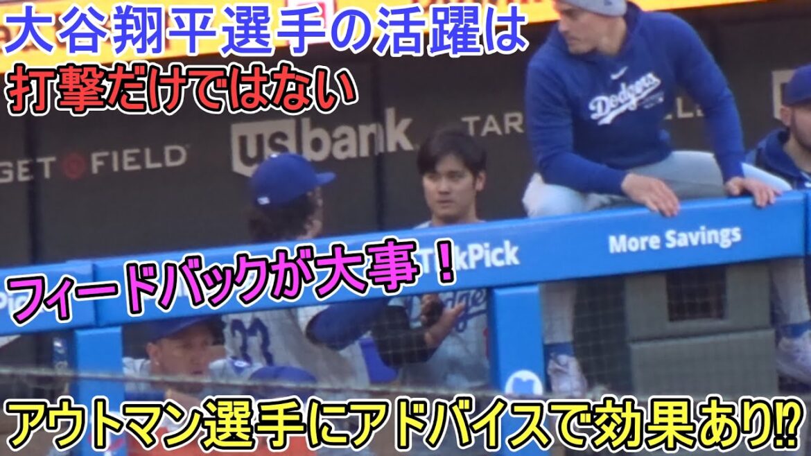 大谷翔平選手が第1打席で三振に終わった後、ダグアウトでアウトマン選手に相手投手の球種を伝え、アドバイスをするシーンが見られた。