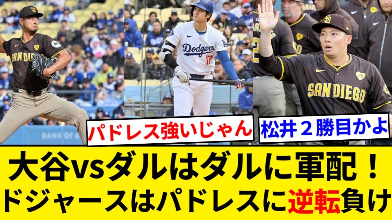大谷vsダルビッシュはダルに軍配!3打数無安打松井裕樹は5戦連続無失点で防御率0点台!メジャー2勝目!ドジャースはパドレスに逆転負け【5chまとめ】【なんJまとめ】
