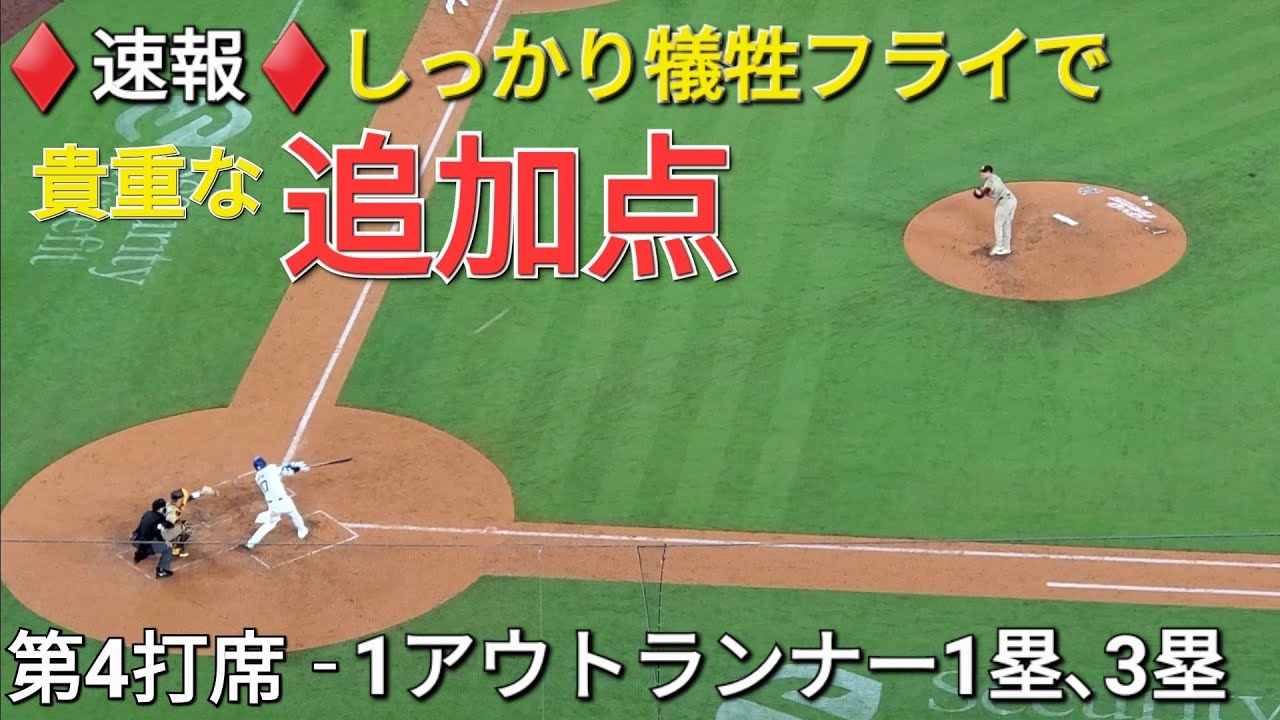 ♦️速報♦️第4打席【大谷翔平選手】1アウトランナー1塁、3塁での打席‐しっかり犠牲フライで貴重な追加点 vsパドレス~シリーズ2戦目