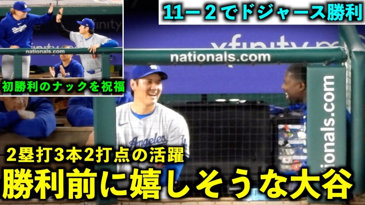 初勝利の同僚を祝福!2塁打3発2打点で勝利前に嬉しそうな表情を見せる大谷翔平!【現地映像】4月25日ドジャースvsナショナルズ第2戦