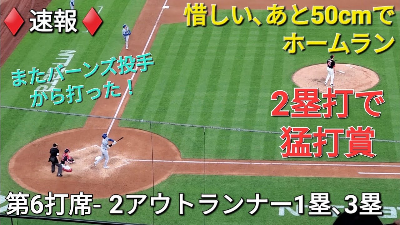 ♦️速報♦️第6打席【大谷翔平選手】2アウトランナー1塁、3塁での打席-惜しい、あと50cm!左中間のフェンス直撃の2塁打 vsナショナルズ〜シリーズ2戦目〜