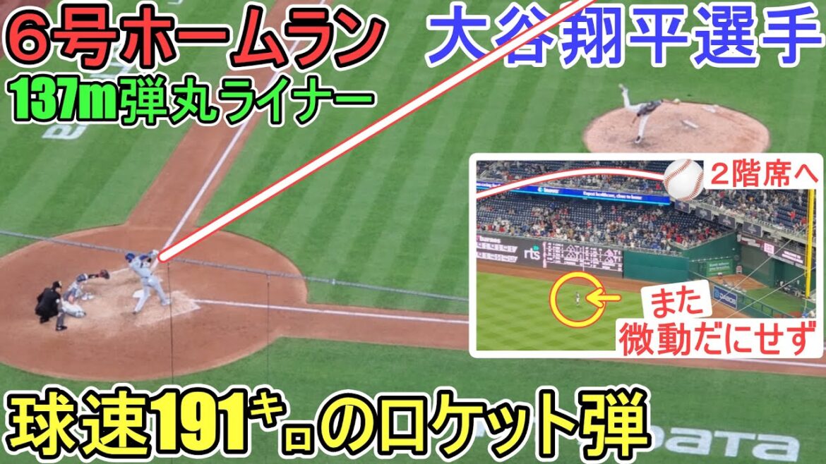 ㊗6号ソロのダメ押しホームランを打つ大谷翔平選手。ライトスタンドの2階席飛び込む137m弾のホームランはメジャー最速191キロ。