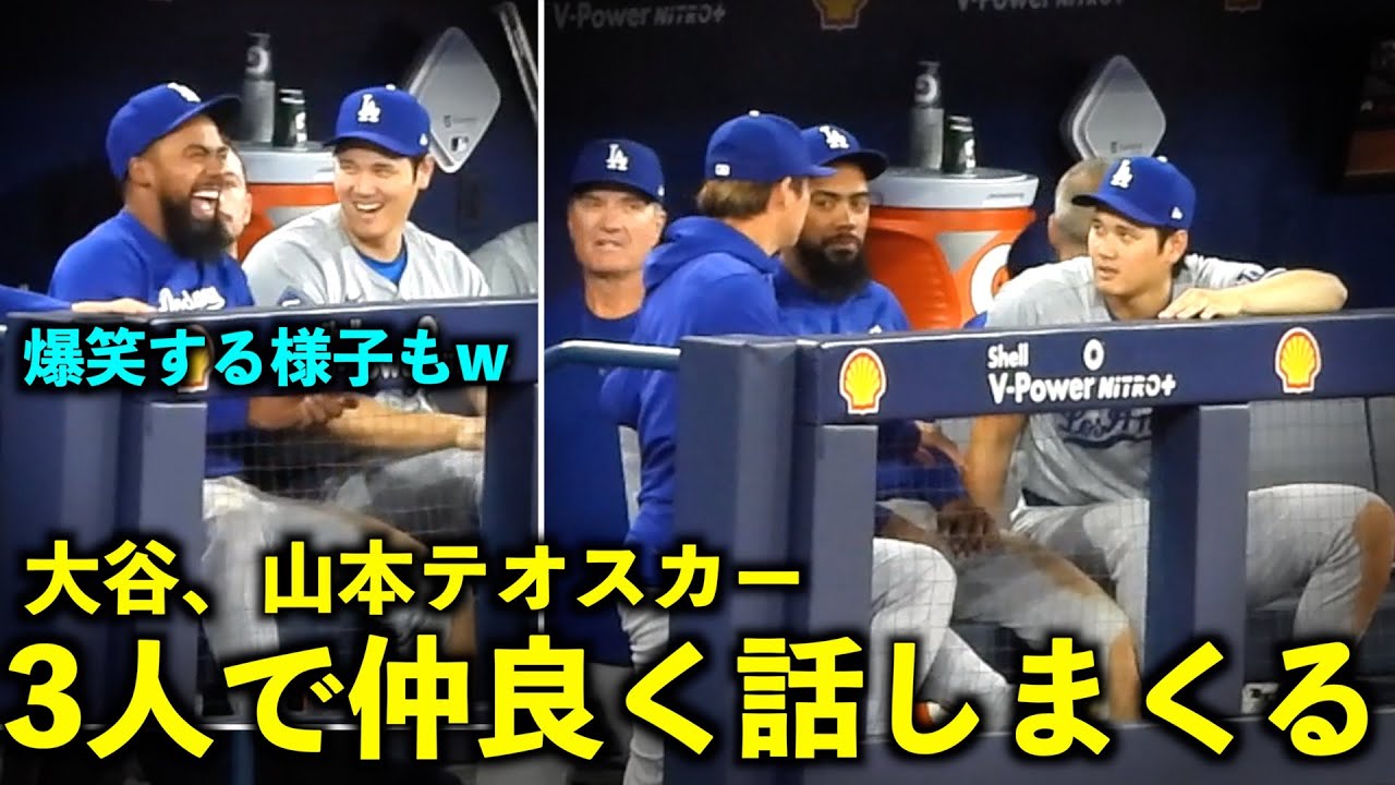爆笑する様子もw 大谷翔平、山本由伸、テオスカーが3人で仲良くお話し!【現地映像】4月27日ドジャースvsブルージェイズ第1戦