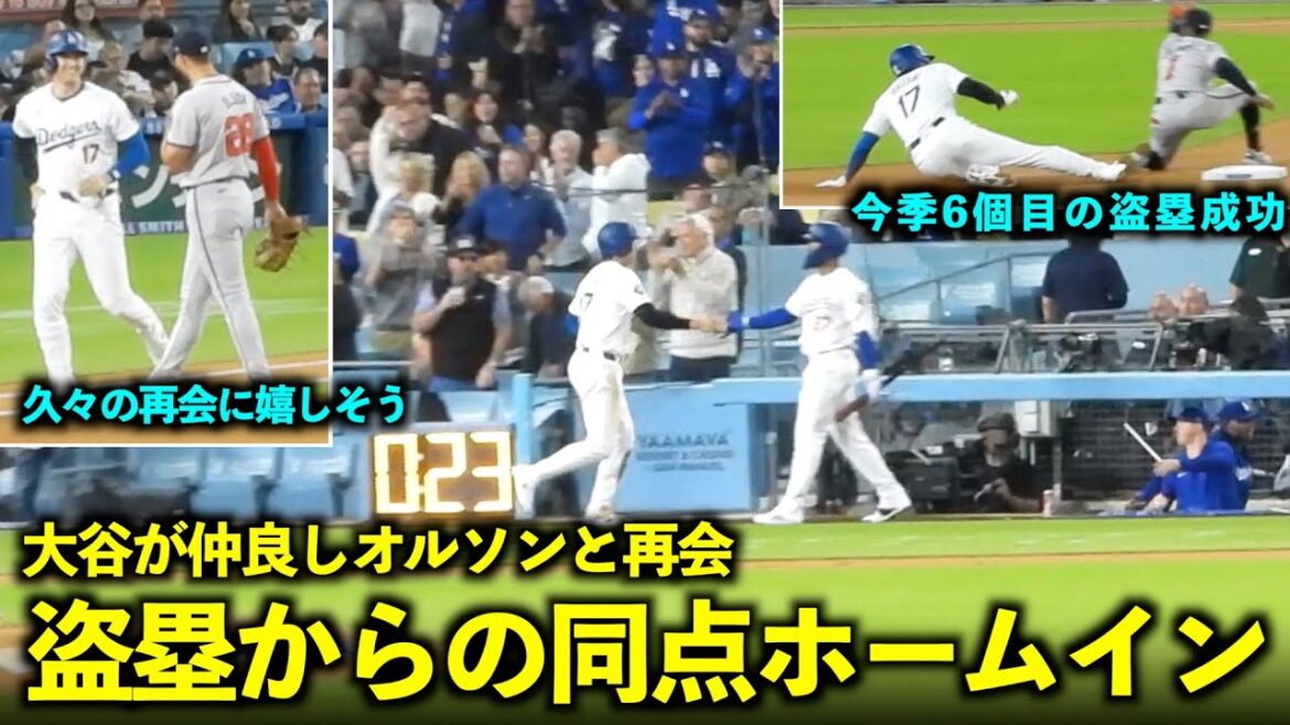 1塁でオルソンとの再会に嬉しそうな大谷翔平! 今季6個目の盗塁成功からの同点ホームイン!【現地映像】5月4日ドジャースvsブレーブス第1戦