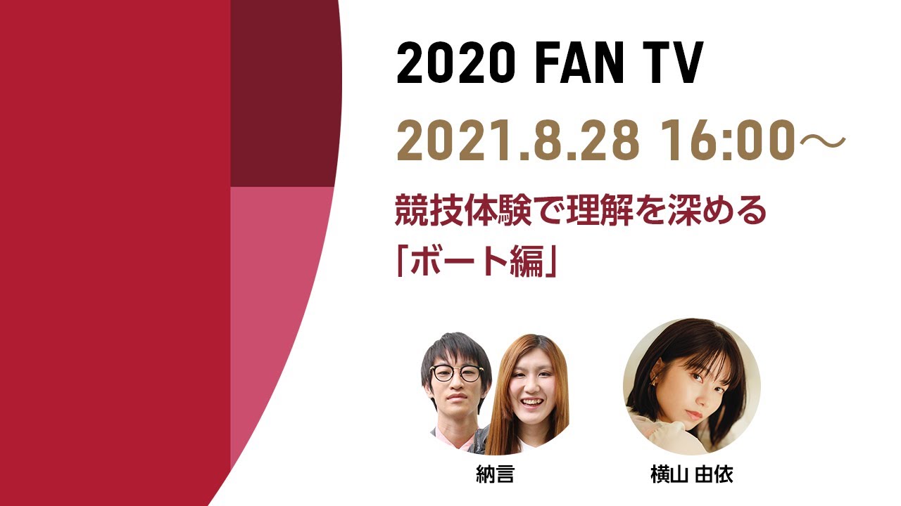 [配信開始は 5:05 から] 東京2020大会をもっと楽しむ配信番組「2020 FAN TV」、5日目(8/28)はボートを紹介します。オリンピック競技は、1人で漕ぐシングルから、最大8人で漕ぐエイトまで複数の種目があり長い歴史があります。パラリンピックのボートは2008年の北京大会からと比較的歴史が浅いですが多彩な種目が開催されます。一見簡単そうに見えるボートですがやってみると意外と難しいもの。そんなボートをゲストの納言のお二人とMCの横山由依さんの体験を交えながら競技を詳しくご紹介します。