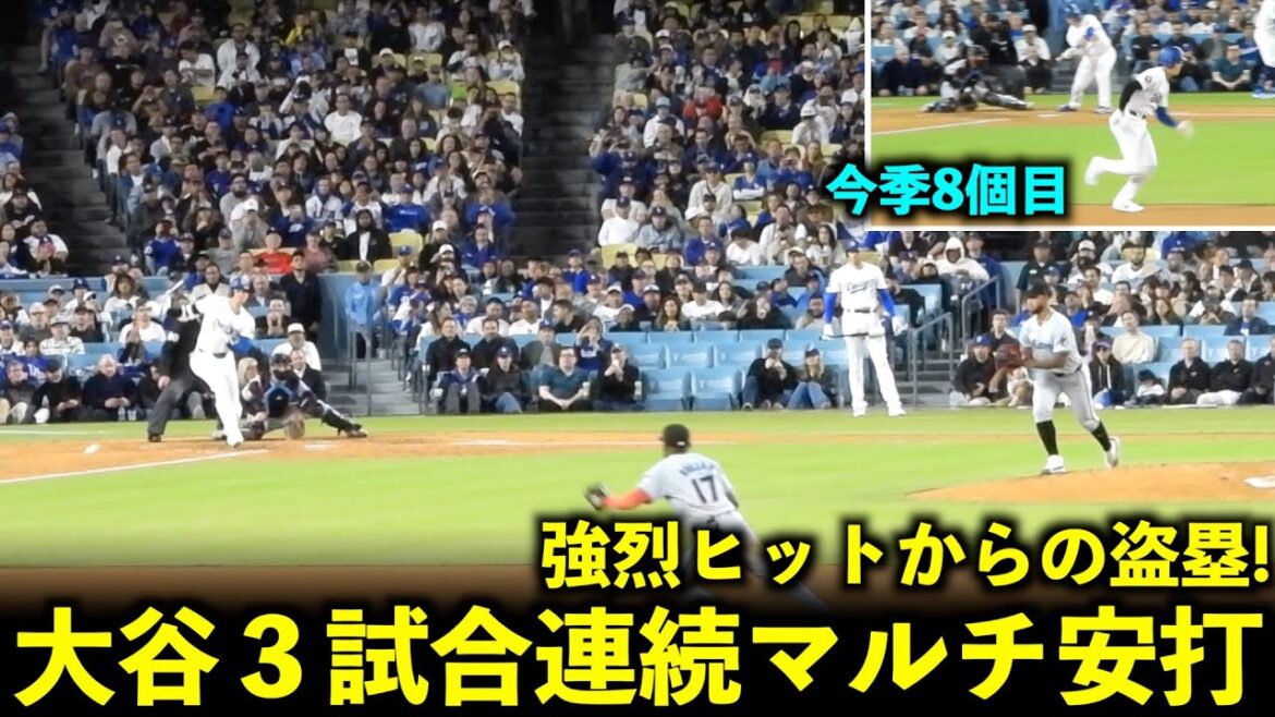 3試合連続マルチ!大谷翔平 強烈ライト前ヒットからの今季8個目の盗塁!【現地映像】5月7日ドジャースvsマーリンズ第1戦