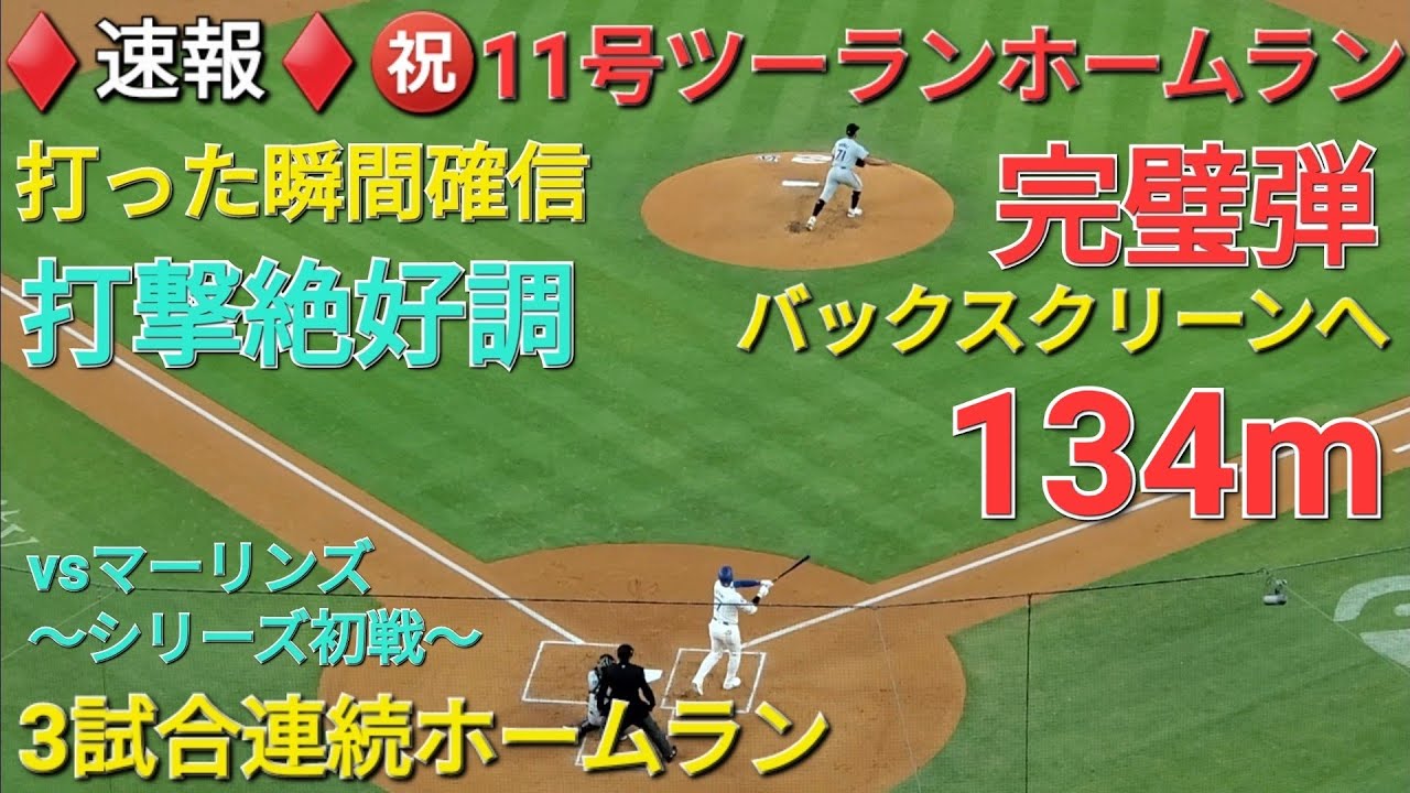 ♦️速報♦️㊗️11号ツーラン同点ホームラン【大谷翔平選手】またバックススクリーンへ-3試合連続ホームラン vs マーリンズ〜シリーズ初戦〜