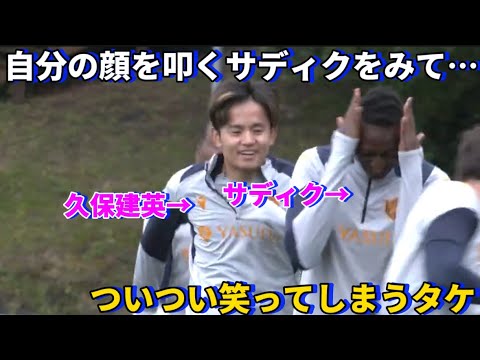 テンションが上がり自分の顔を叩きだすサディクをみてついつい笑顔になる久保建英!!笑