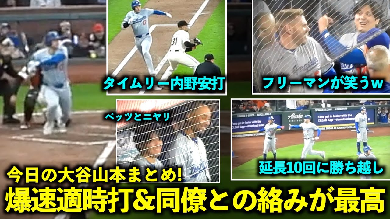 今日の大谷山本まとめ!爆速すぎたタイムリー内野安打&ベッツやフリーマンとの絡み、延長10回の勝ち越しシーンに注目!【現地映像】5月14日ドジャースvsジャイアンツ第1戦