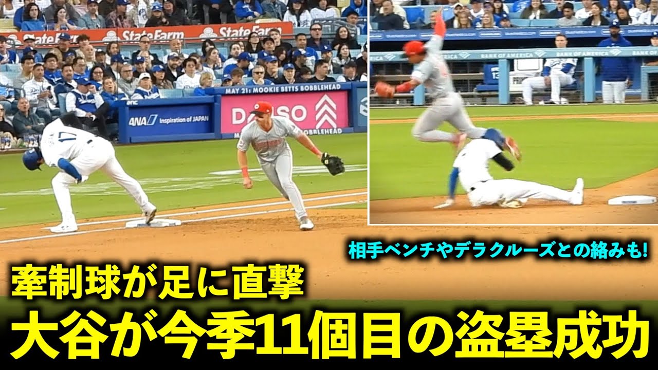 牽制球が足に直撃!その後、大谷翔平が今季11個目の盗塁成功!相手ベンチやデラクルーズとの絡みも!【現地映像】5月17日ドジャースvsレッズ第1戦