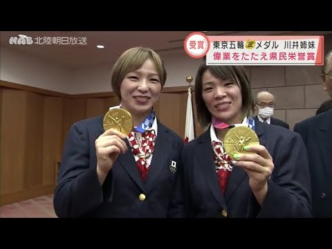 東京オリンピックレスリング女子で金メダルに輝いた川井梨紗子選手、友香子選手の姉妹に石川県民栄誉賞が贈られました。家族で石川県庁を訪れた川井梨紗子選手と友香子選手。胸には金メダルが輝いています。姉の梨紗子選手は東京オリンピックのレスリング57キロ級で、妹の友香子選手は62キロ級でそれぞれ金メダルを獲得。姉妹揃っての金メダルという偉業をたたえ、30日2人に県民栄誉賞が贈られました。県民栄誉賞はこれまで元メジャーリーガーの松井秀喜さんや柔道オリンピック金メダリストの松本薫さんが受賞していて、梨紗子選手はリオオリンピックでの金メダル獲得に続き2度目の受賞です。また先週、入籍を発表したばかりの梨紗子選手。30日は夫で元レスリング選手の金城希龍さんも同席し、夫婦揃って喜びを分かち合いました。姉妹は3年後のパリオリンピック挑戦については「練習をしながら決めていきたい」と話していました。