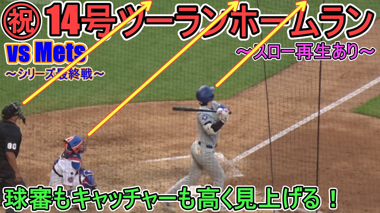 ㊗14号ツーランホームランを打つ大谷翔平選手(打者のみの映像)。球審もキャッチャーも高く見上げる。スロー再生動画あり。