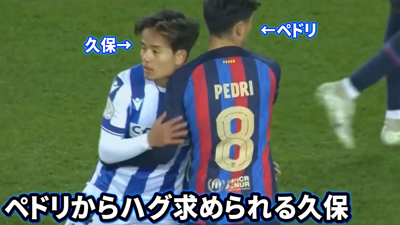 試合中にペドリからハグ求められる久保建英