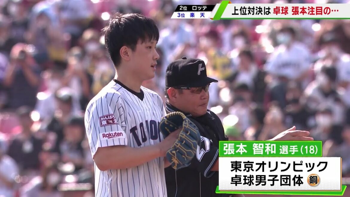 楽天戦の始球式に登場したのは東京オリンピック卓球銅メダリスト・張本智和(木下グループ)。生まれ故郷の仙台で堂々たる姿をみせた。