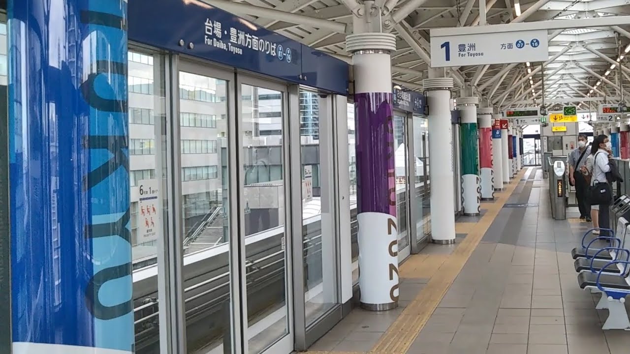 オリンピック開催前はホームの柱にTOKYO2020ロゴが並んでいた東京臨海新交通臨海線ゆりかもめのお台場海浜公園駅構内の風景です。
