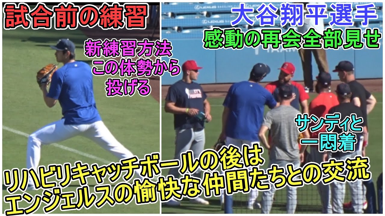 試合前の練習でリハビリキャッチボールをする大谷翔平選手。新しい練習方法を取り入れて投げる様子が見れた。その後はエンジェルスの愉快な仲間たちとの交流をする。