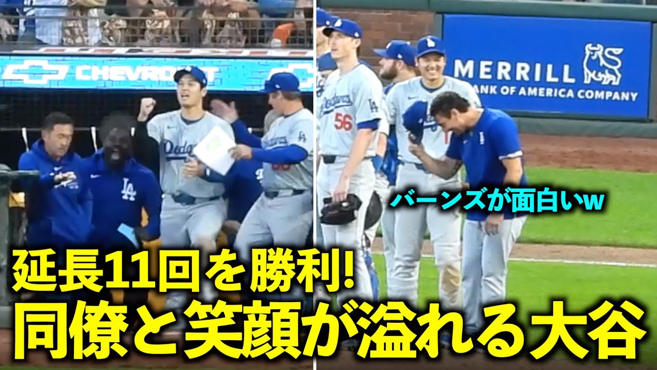 延長11回を制しガッツポーズ!バーンズと笑顔が溢れる大谷翔平【現地映像】6月30日ドジャースvsジャイアンツ第2戦