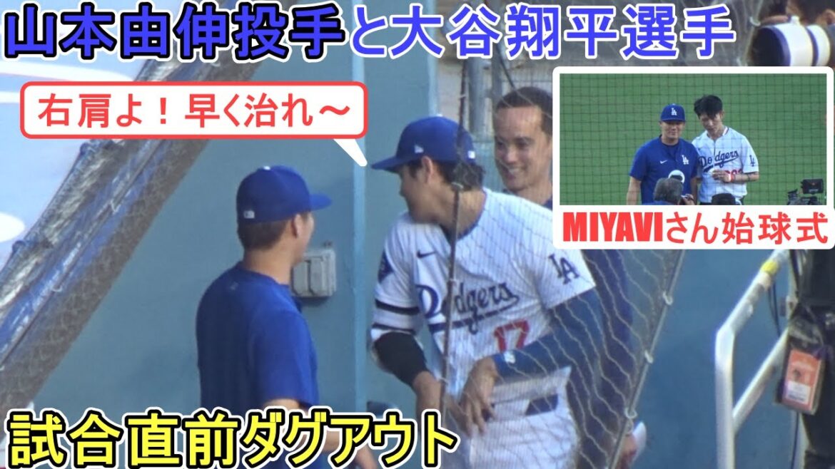 試合直前ダグアウトで始球式のキャッチャーを務める山本由伸投手。大谷翔平選手は各選手やスタッフとハンドシェイク。