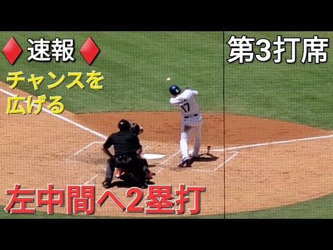 ♦️速報♦️第3打席【大谷翔平選手】2アウトランナー1塁での打席 – 左中間へ2塁打でチャンスを広げる vs ジャイアンツ〜シリーズ最終戦〜