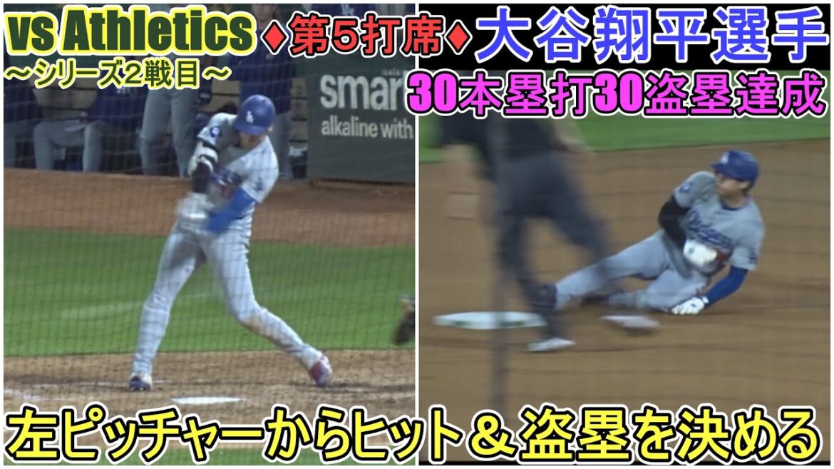 ~第5打席~センター前ヒットで出塁後は30個目の盗塁を成功させる大谷翔平選手。メジャー日本人選手として初の30本塁打と30盗塁を成功させる。その後、テオスカー・ヘルナンデス選手とダブルスティールで31個目の盗塁も決める。