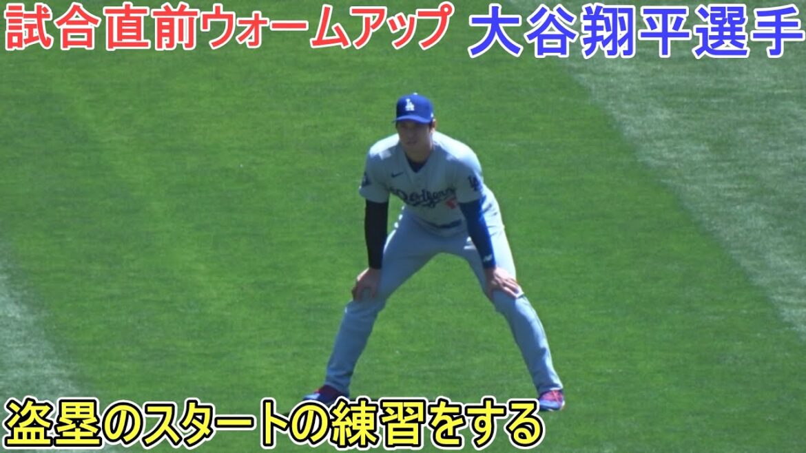 試合直前ウォームアップをする大谷翔平選手。ウォームアップは常に盗塁スタートの練習をする。