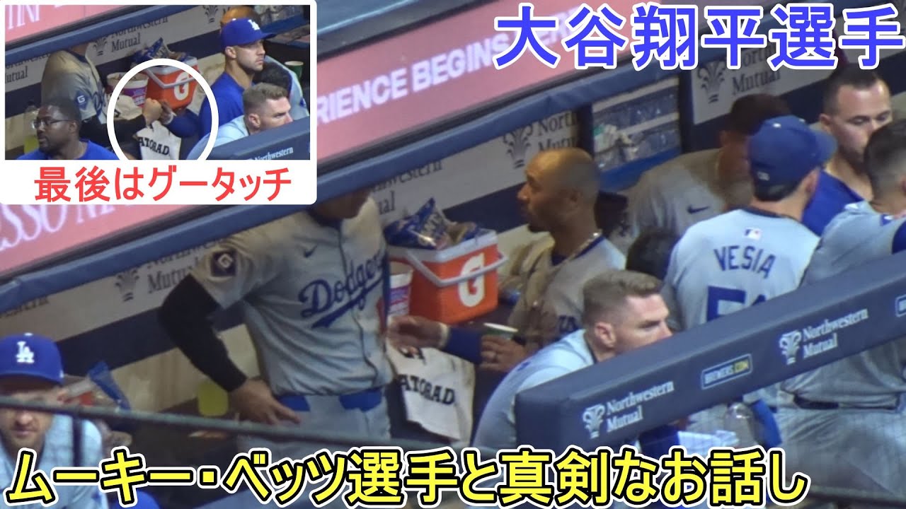 試合中のダグアウトでムーキー・ベッツ選手を真剣にお話をする大谷翔平選手。