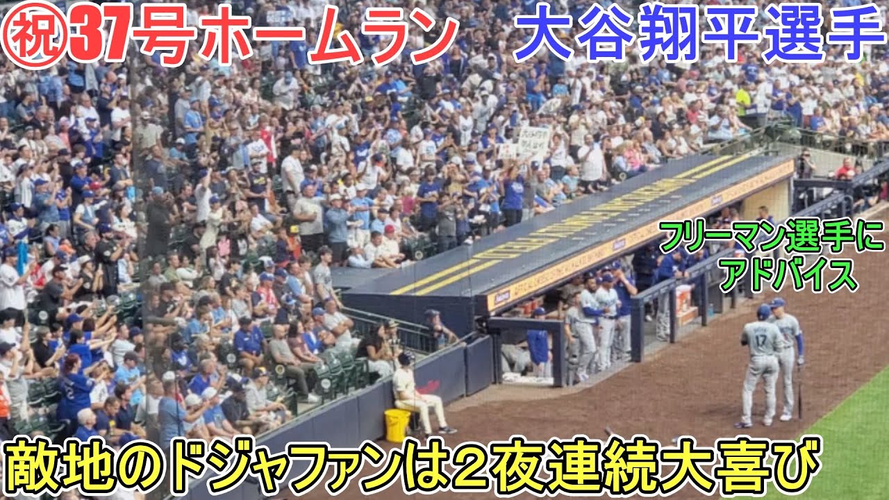 ㊗37号ホームランは野手は一歩も動かず、ライトスタンド一直線で2階席に飛び込む126m弾で敵地のファンもどよめく。敵地ミルウォーキーに応援しに来たドジャースファンは2夜連続総立ちで大喜び。