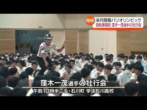 壮行会は窪木一茂選手(35)の母校学法石川高校で開かれました。古殿町出身の窪木選手はパリオリンピック自転車競技トラック種目の「パシュート」「マディソン」「オムニアム」の3種目に出場しメダル獲得をめざします。2016年のリオデジャネイロオリンピックでは、男子オムニウムで14位、今回はメダルを狙いたいと意気込みを語りました。