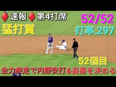 ♦️速報♦️第4打席【大谷翔平選手】1アウトランナー1塁での打席 – 全力疾走で内野安打&盗塁(52個目)を決める vs ロッキーズ〜シリーズ初戦〜