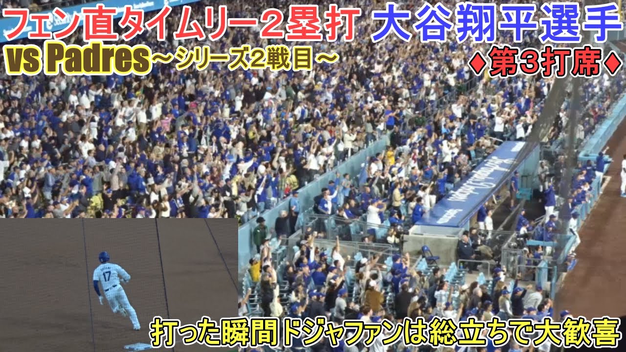 ~第3打席~初球を狙い打ちでフェンス直撃のタイムリー2塁打で勝ち越しとなる打点を挙げる大谷翔平選手。打った瞬間はドジャースファンも総立ちで大歓喜!