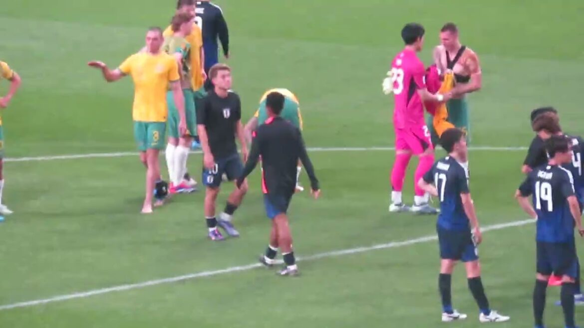 オーストラリア代表戦1ー1引き分け。試合後の光景。町田でチームメイトの谷晃生とミッチェル・デュークユニ交換2024/10/15 ワールドカップアジア最終予選 日本代表ーオーストラリア代表埼玉スタジアム
