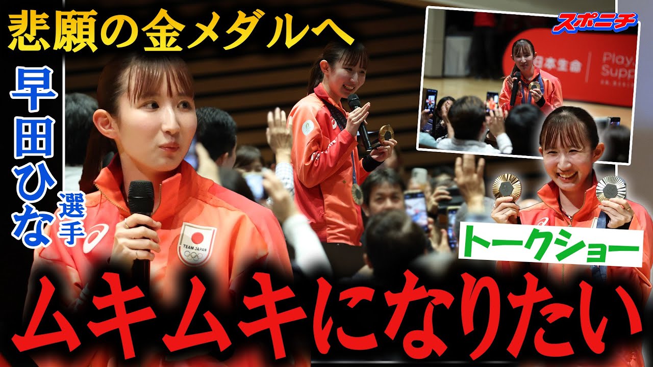 「(パリ五輪では)自分のスタイルを貫いて、でもかなわなくて。自分自身、生まれ変わって、違う早田ひなでプレーしていきたい。(これまでのスタイルを)ぶっ壊して、新しい自分でやっていきたい。より攻撃的にしていきたいし、あと一つ思っているのは、トレーナーさんはムキムキなんですけど、私はスポーツ選手っぽくないといわれる。トレーナーさんと同じぐらいムキムキになりたい」