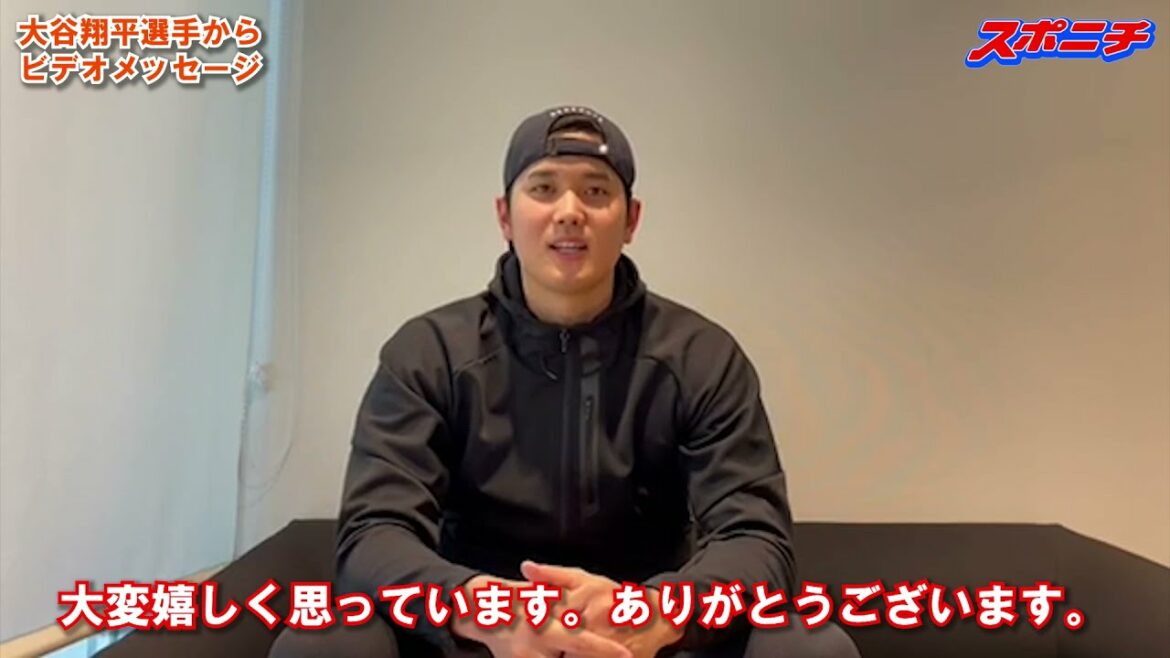 帽子のつばを後ろ向きにかぶり、トレーニングウエア姿でビデオメッセージに登場した。大谷が「グランプリを受賞させていただいたことを大変うれしく思います。ありがとうございます」とはにかむと、場内から拍手が注がれた。
