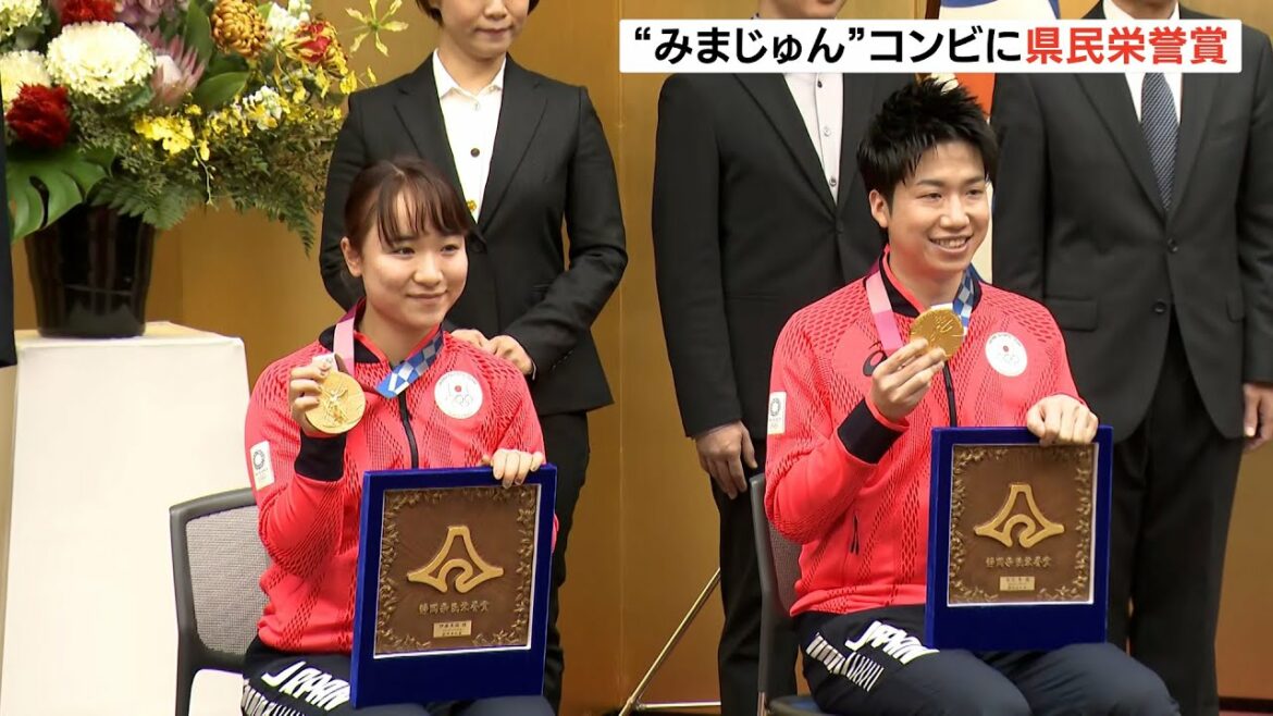 東京オリンピック卓球で金メダルを獲得した磐田市出身の水谷隼選手と伊藤美誠選手に12月27日午前、県民栄誉賞が贈られました。