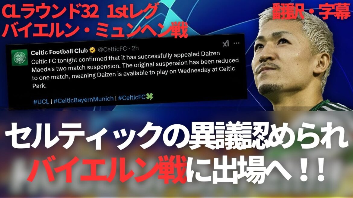 チャンピオンズリーグ・ラウンド32・プレーオフステージにて、バイエルン・ミュンヘンとのファーストレグを水曜日に予定していたセルティックは、レッドカードで2試合出場停止の処分を受けていた前田大然について、この処分に異議を申し立て、認められたことによって、前田大然がこの試合に出場が可能になった。セルティックファンがこの興奮を速報で伝える。