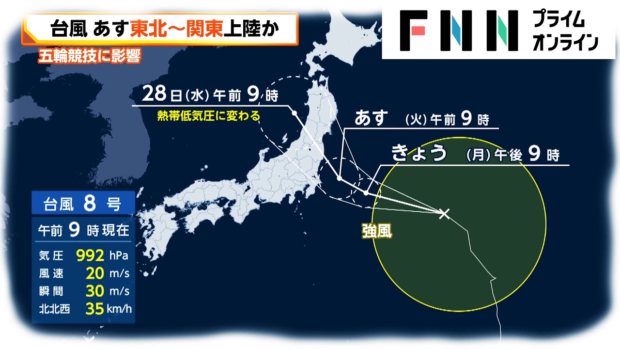 台風8号は、東から西へと異例のコースで進んでいて、27日には、東北から関東に上陸する見込み。
