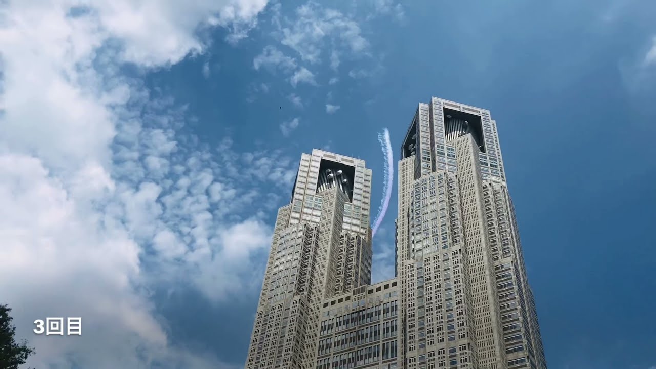 都庁の上で大きく旋回し五輪の輪を描きました。