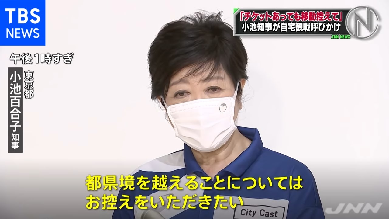 「都民の中には近県の、近県でもないですかね、有観客を認めているところの切符をお持ちの方もいると思いますけれども。都県境を越えることについては、 お控えをいただきたい」(東京都 小池百合子知事)