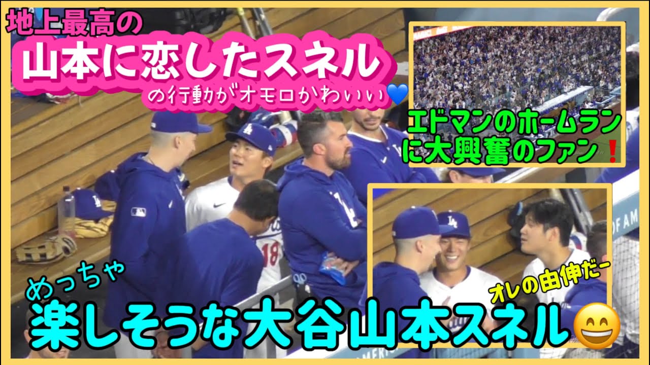 地球上最高!好投で2勝目をした山本投手に恋したスネルの驚きの行動をとらえました。山本スネル大谷選手が楽しそうに談笑する様子やエドマンの3ランホームランに大興奮のファンとダッグアウトなどの映像です!