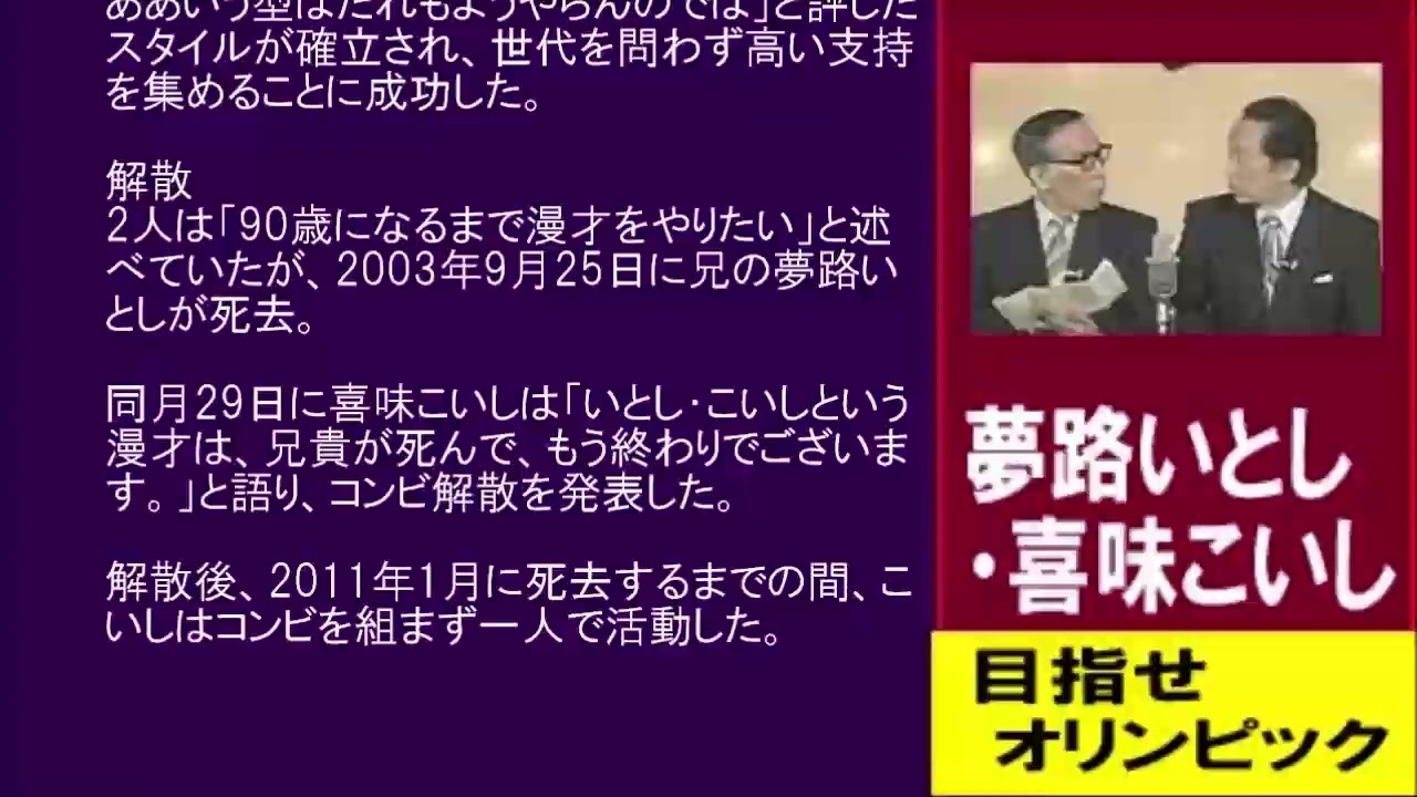 なお夢路いとしの死後、いとし・こいしを師と慕うはな寛太・いま寛大がいとし・こいしを襲名するとネタにするようになった。喜味こいしは2人に「自分が死んだらいとし・こいしを継いでもいい」と言ったがはな寛太が2007年に死去し、襲名は幻に終わった。”