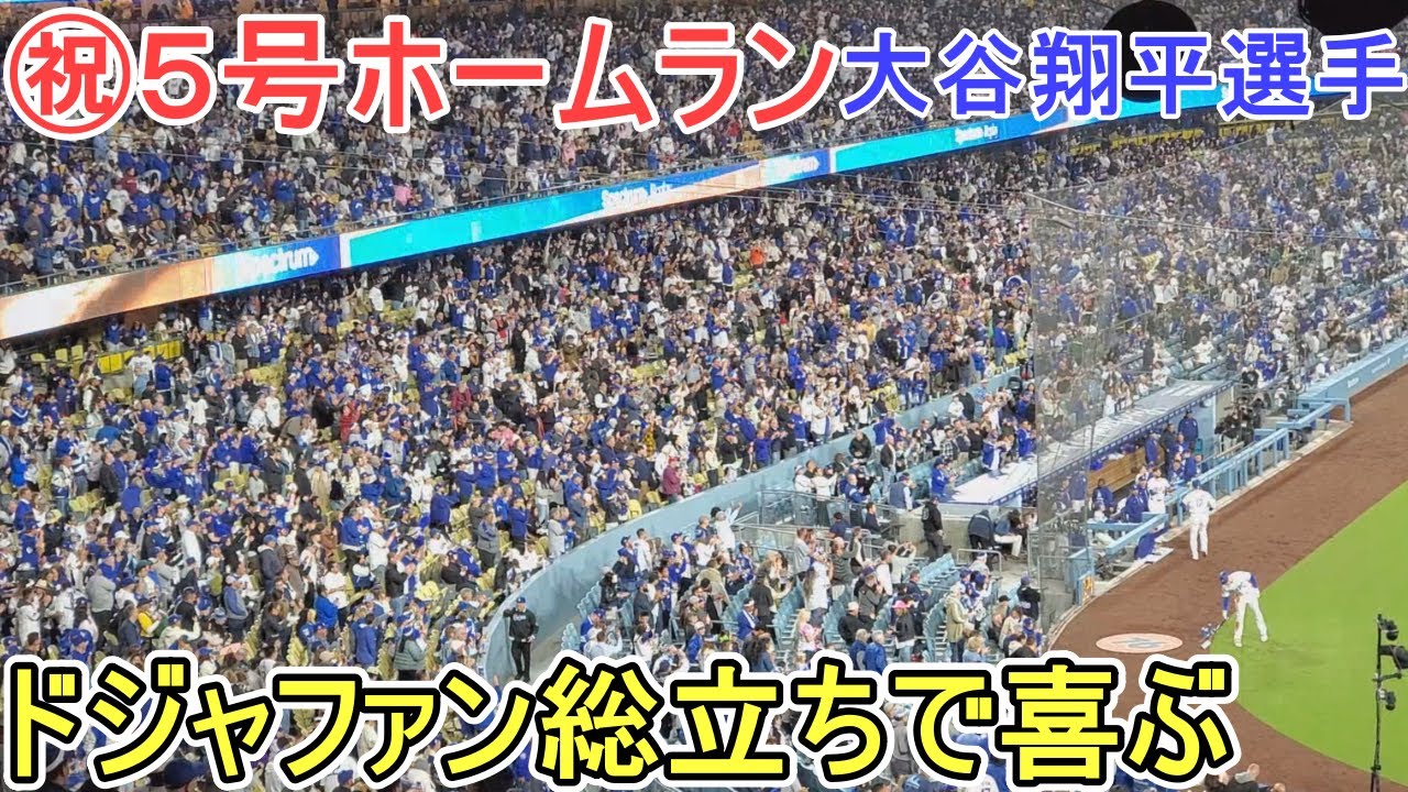 ㊗5号ホームランを打つ大谷翔平選手。センター方向バックスクリーンに飛び込むホームラン。元チームメイトのミッキー・モニアック選手の頭上を超えていく。3塁側ベンチ裏のドジャースファンは総立ちで喜ぶ!
