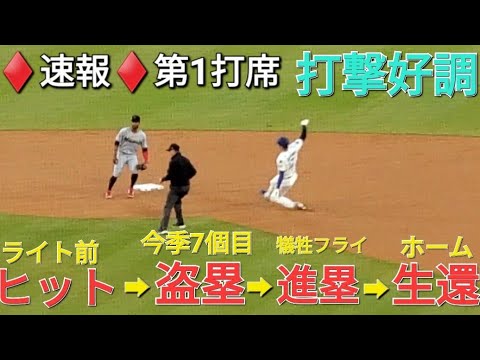 ♦️速報♦️第1打席【大谷翔平選手】リーディングオフでの打席ーライト前ヒットで出塁⚾️盗塁を決める⚾️犠牲フライで3塁へ⚾️フリーマン選手のタイムリーでホームイン vsマーリンズ〜シリーズ初戦〜