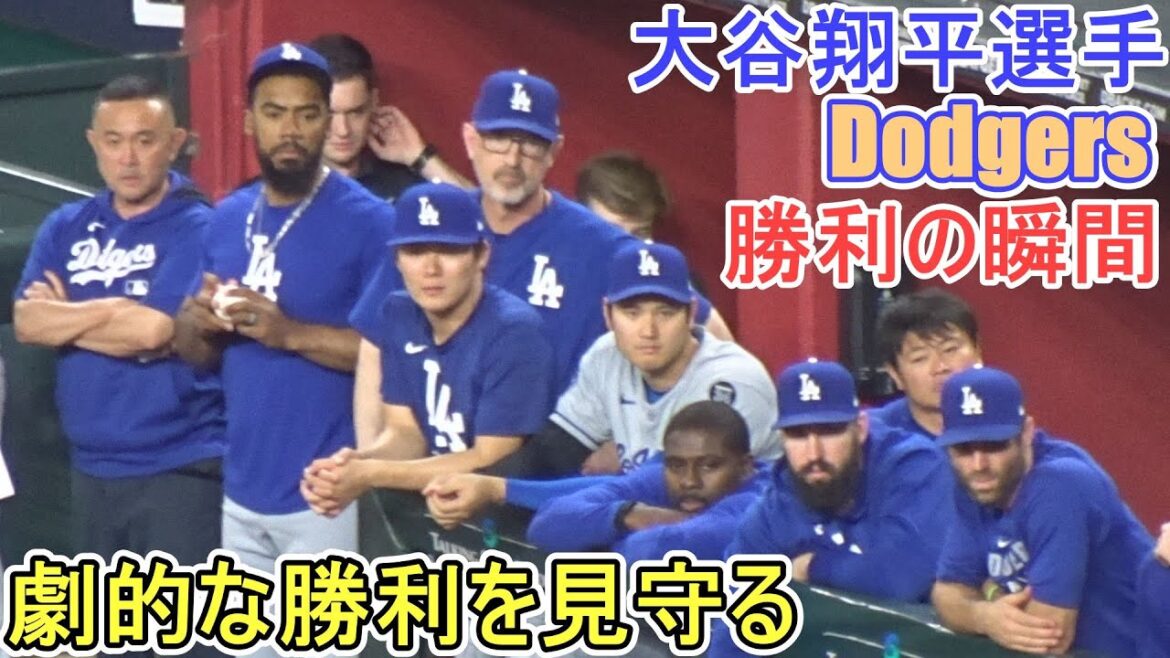 ♢ドジャース・勝利の瞬間♢アリゾナ・ダイヤモンドバックスとの2戦目を見事な勝利でシリーズタイにする。大谷翔平選手は12号ホームランを含む猛打賞の活躍でドジャースの勝利に貢献し喜ぶ。