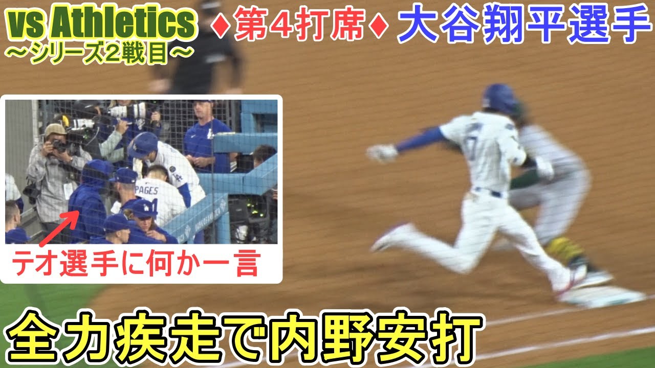 ♢第4打席♢ミゲル・ロハスタイムリーヒット後の大谷翔平選手はサードの前に転がる内野ゴロを全力疾走で内野安打にする。
