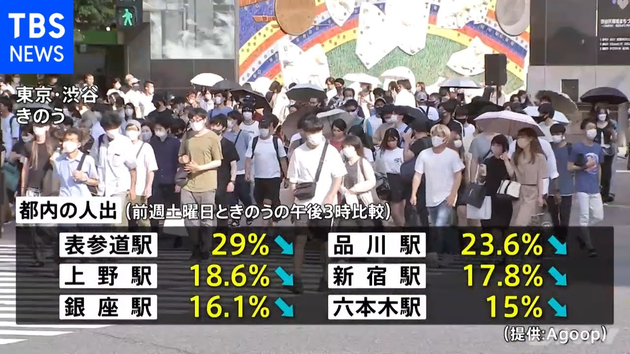 きのう午後3時の人出を前の週の土曜日と比べたところ、▼表参道駅でマイナス29%、▼品川駅でマイナス23.6%、▼上野駅でマイナス18.6%、▼新宿駅でマイナス17.8%など多くの繁華街で減少傾向にあることがわかりました。