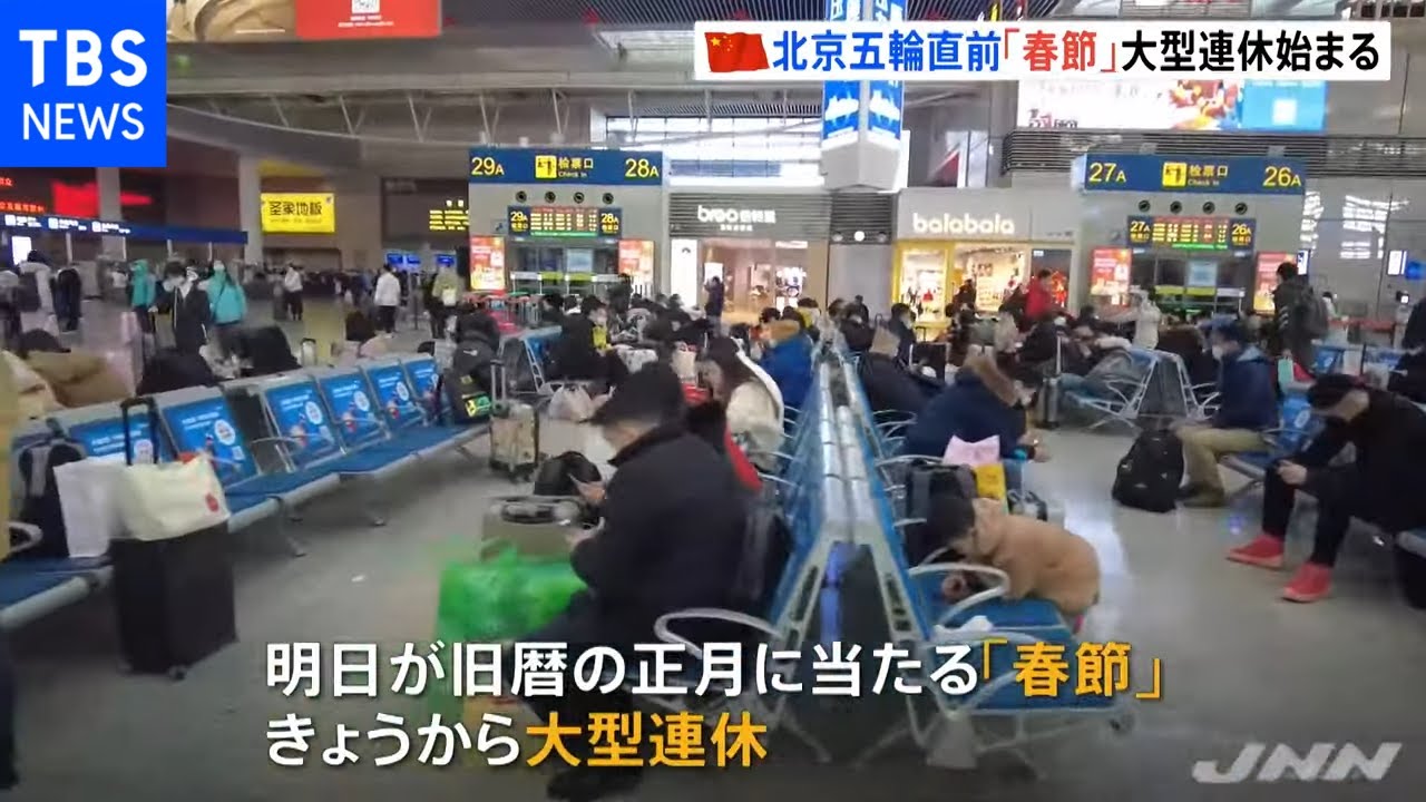 中国では、あすが旧暦の正月に当たる「春節」で、きょうから大型連休が始まり、里帰りする人などが集中することから「民族大移動」とも呼ばれます。多い年はのべ30億人が移動しますが、今年はオミクロン株の感染が各地で確認されたことなどから、11億8000万人にとどまると予想されています。